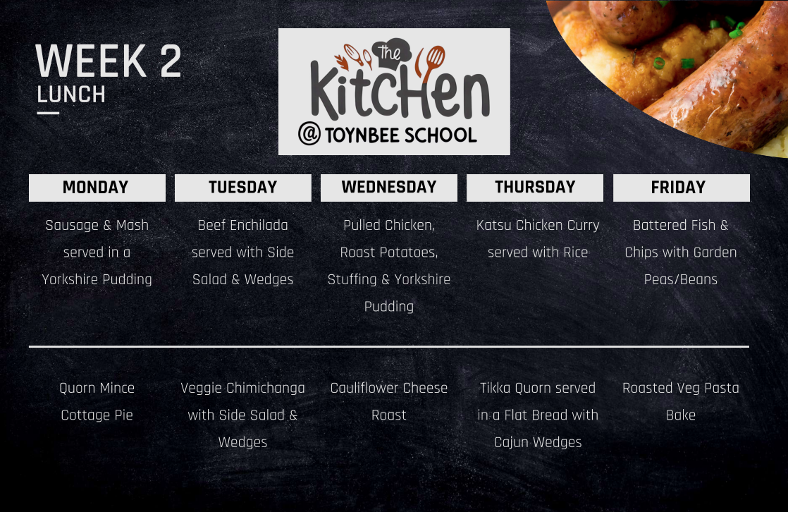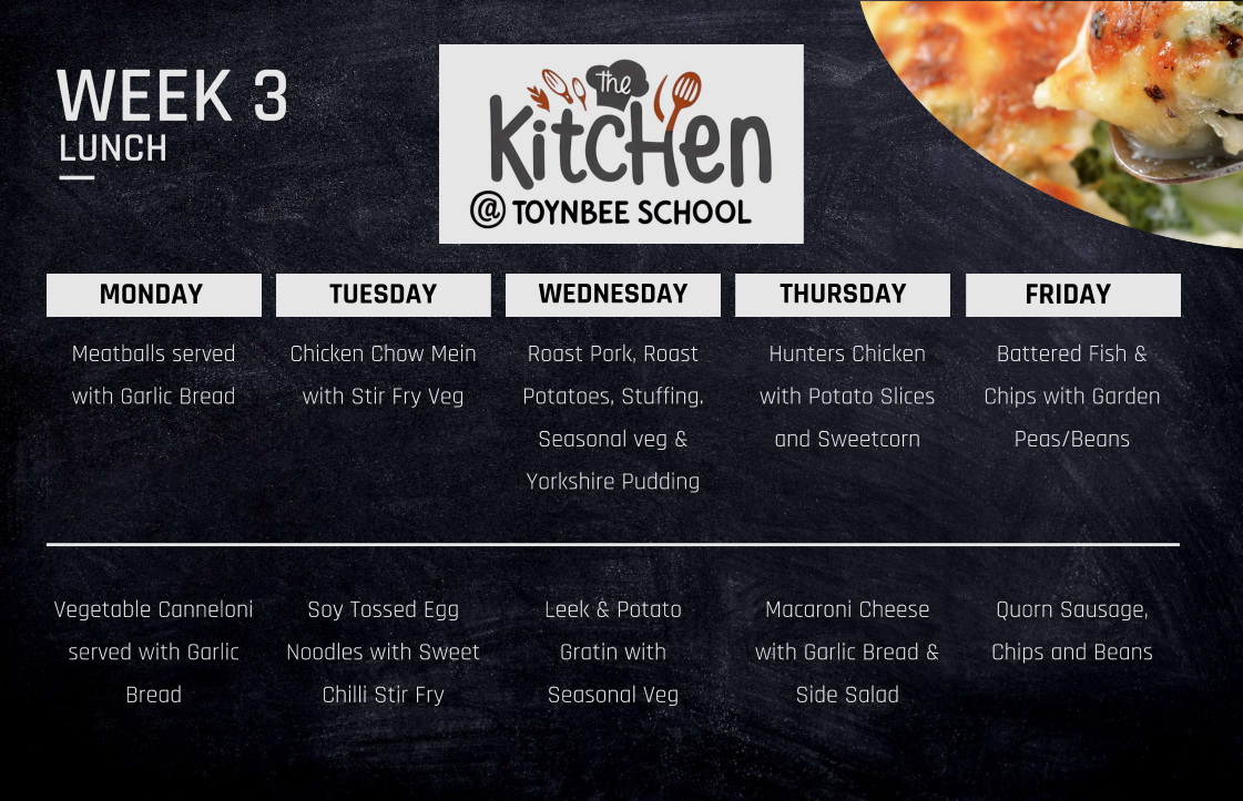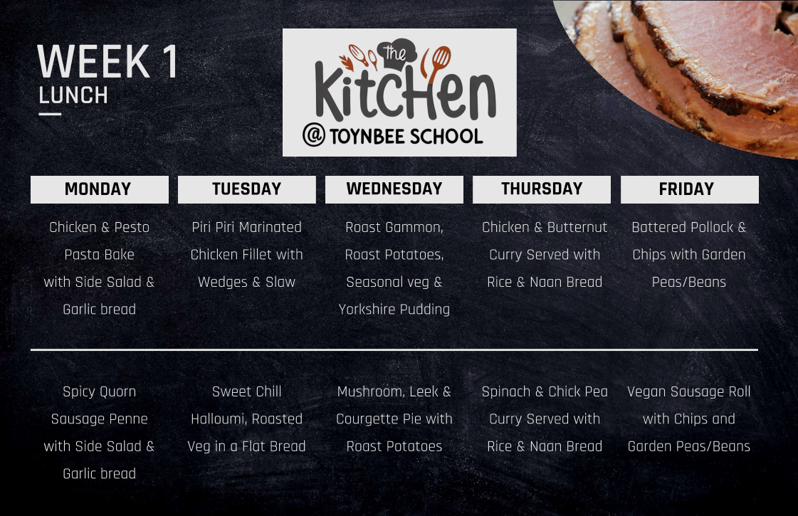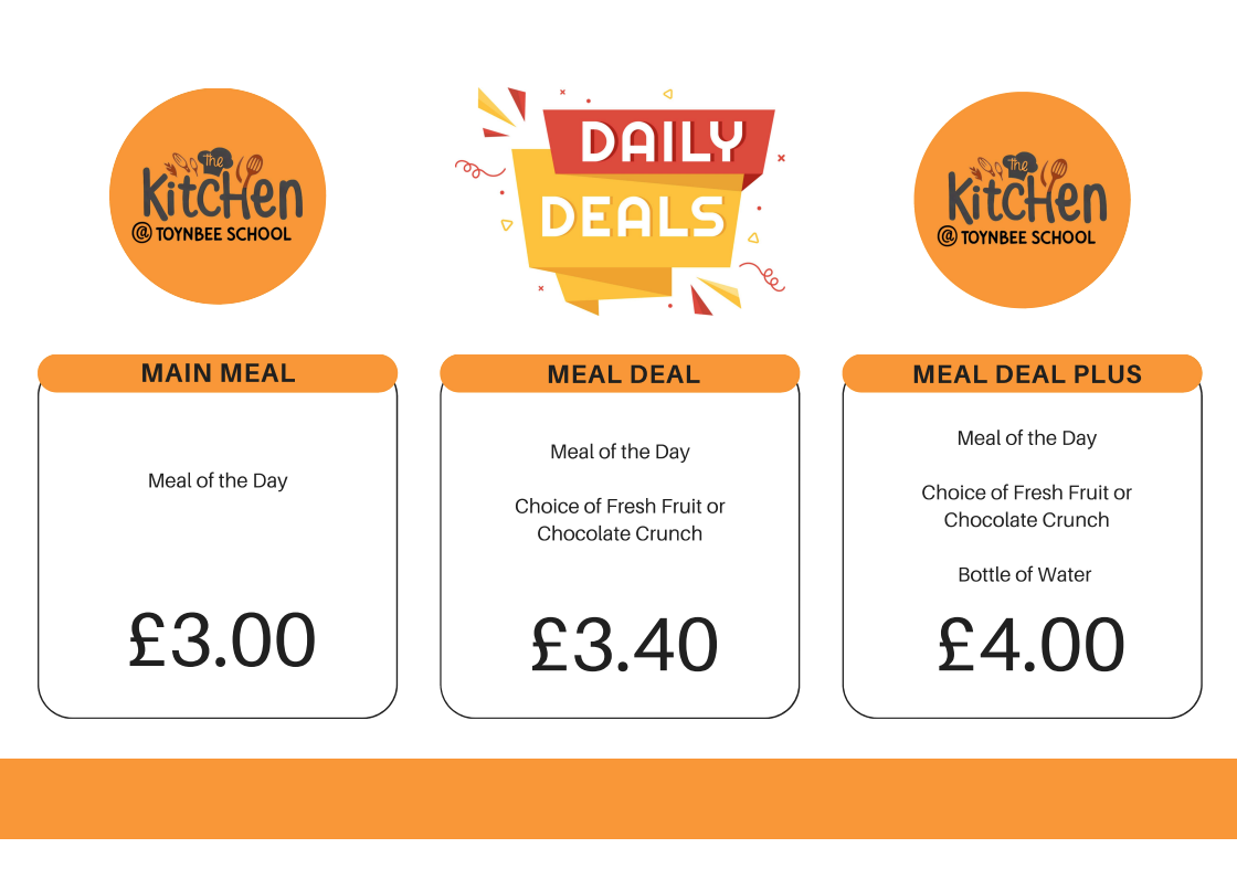 Please get in touch with our Catering Manager, Mel Parker, catering@toynbee.hants.sch.uk who will be happy to answer any questions over our provision.