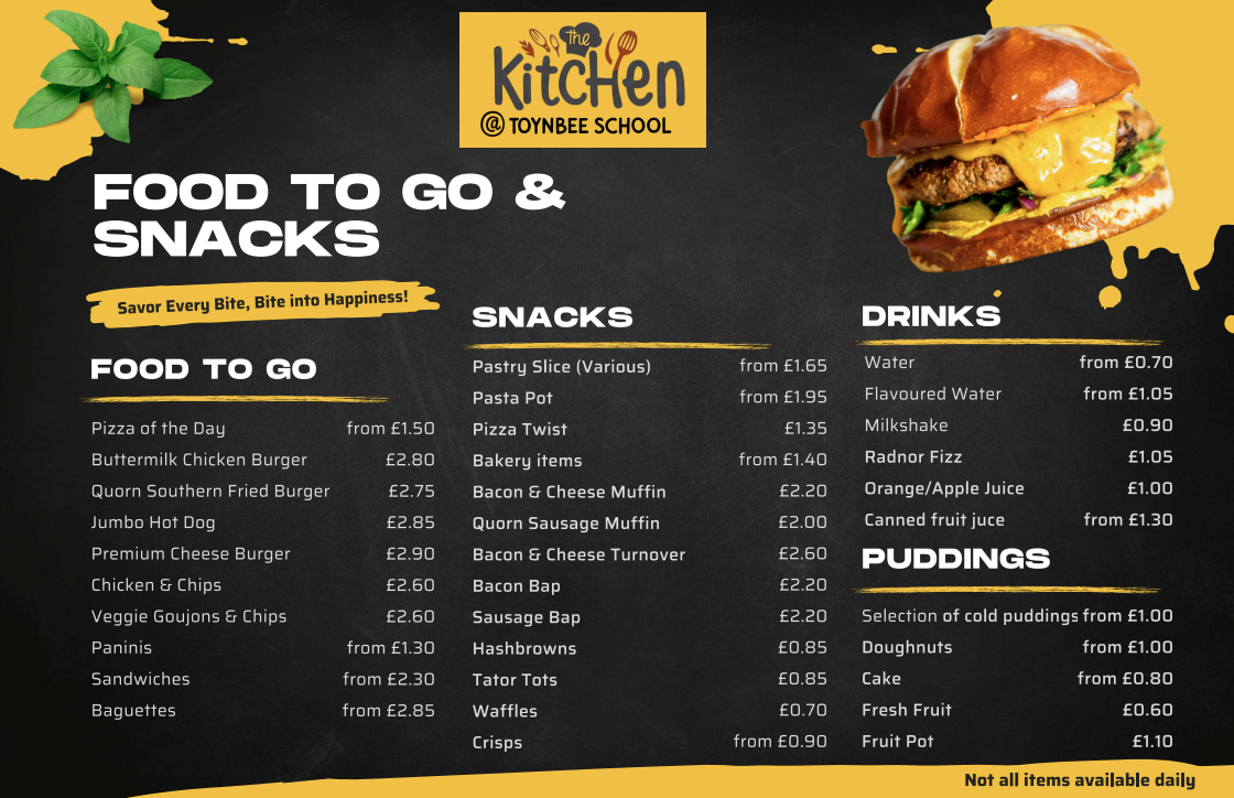 Launched in September 2025, The Kitchen at Toynbee School is our in-house catering service for pupils, staff, and visitors. Our vision is to create a vibrant, sustainable dining experience — from nutritious main meals to convenient “on the go” options — that supports health and wellbeing across our whole community. We are committed to serving high-quality, locally sourced meals that promote health, celebrate variety, and respect the planet. By offering outstanding value for money and ensuring every stakeholder — especially the most vulnerable — enjoys the best meal of their day, we aim to build a welcoming and supportive food culture that fosters community, wellbeing, and a lifelong love of good food.
